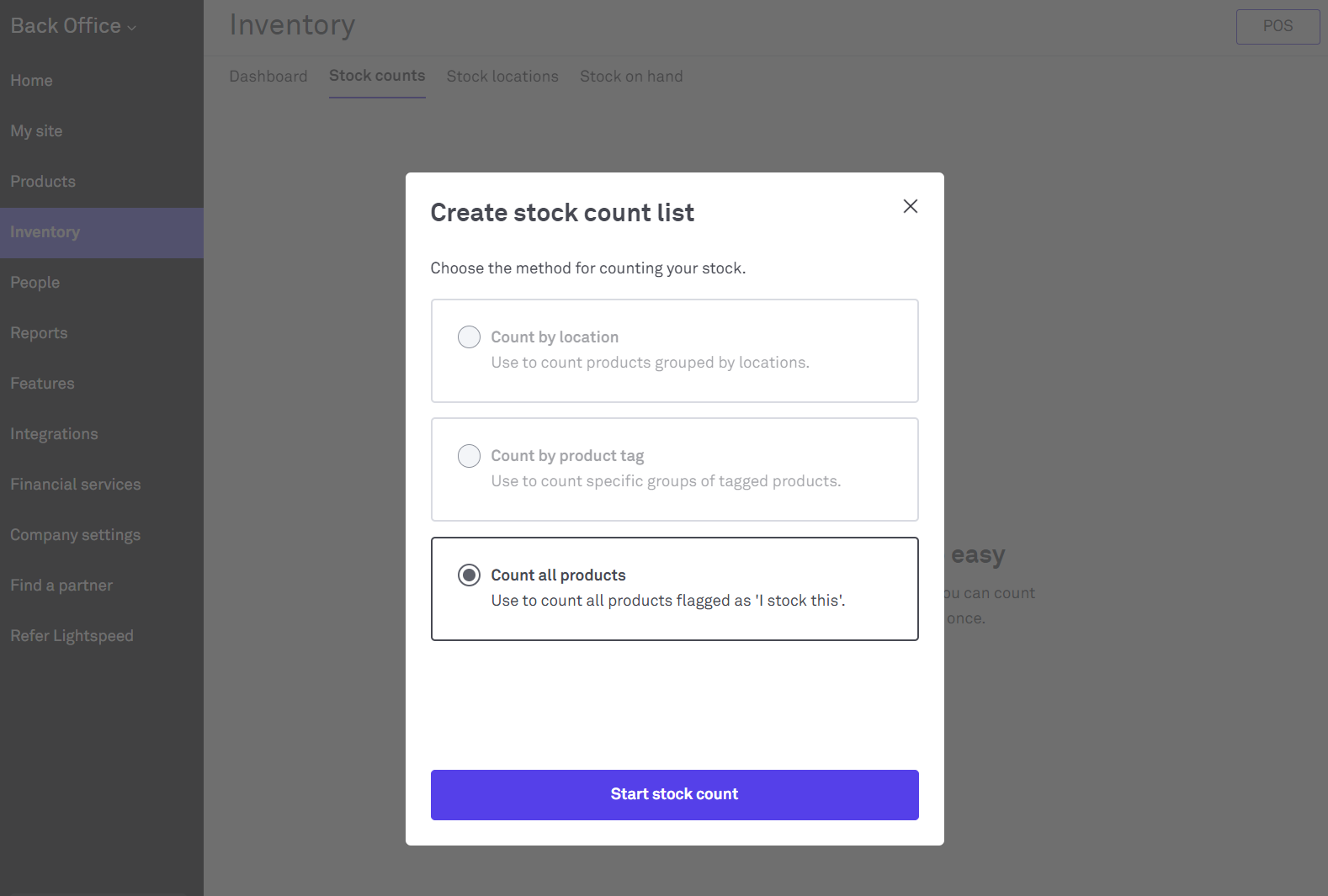 2. Select Count all products, then Start stock count