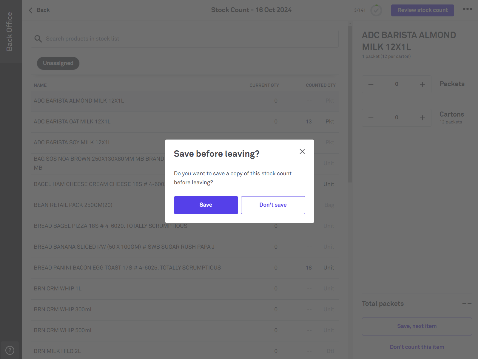 Also be aware that clicking 'Don't save' will delete the current stock count, even if previously saved.