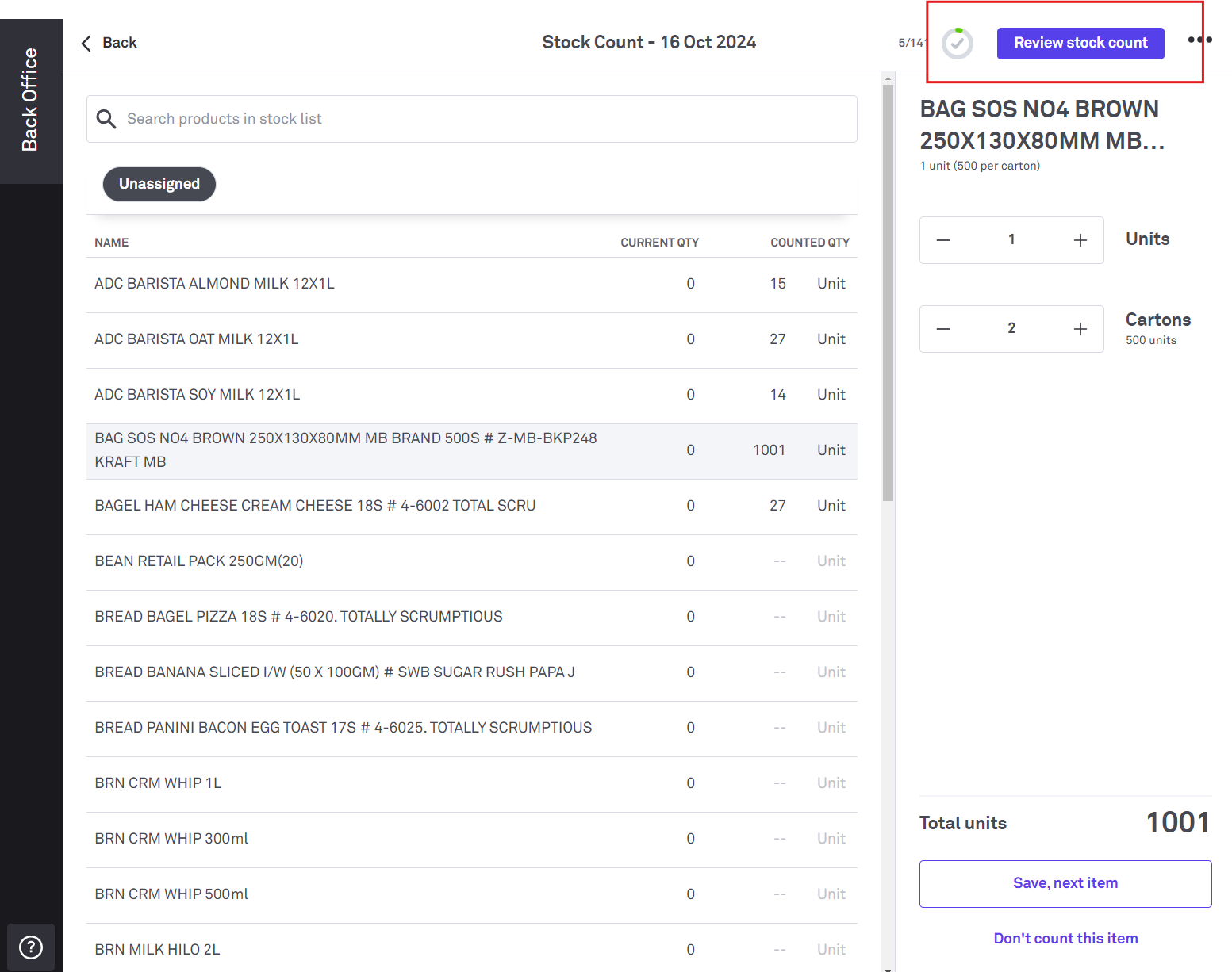 1. Select Review stock count